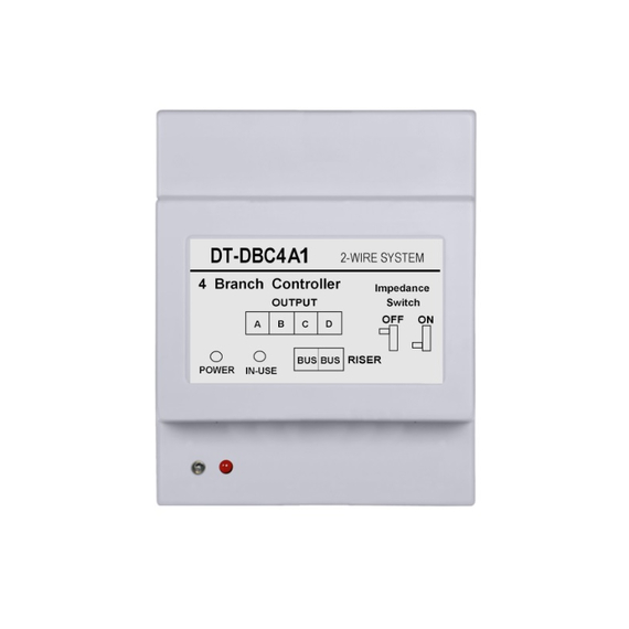 FUTURA Videoelosztó, 4 kapuegység vagy 4 monitor csillagpontos csatlakoztatásához, 2 polarizálatlan vezeték, szétválasztott vonalak, rövidzárvédelem, önteszt, tápfeszültség 24 Vdc, 35 mm_es DIN sínre szerelhető műanyag ház, működési hőmérséklet -10°C~+40°C, méret 89x71x45 mm