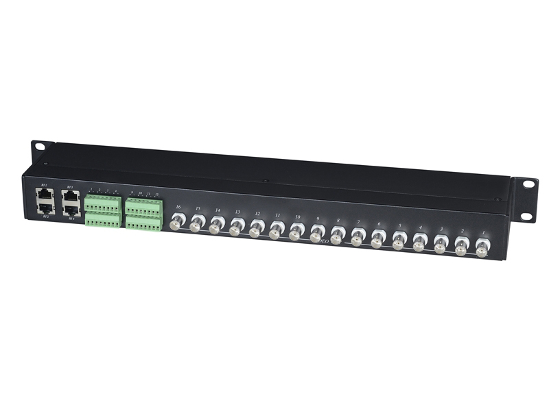 SC&T Videojel átalakító (adó, vagy vevő), 16 csatornás mini passzív koax-UTP csavart érpáras analóg HD videojel (AHD/HD-CVI/HD-TVI) ,BNC, RJ45, valamint sorkapcsos csatlakozókkal, átviteli távolság: 300m (720P), 200m (1080P), 1U Rack kivitel