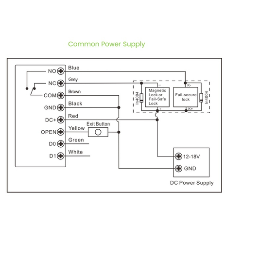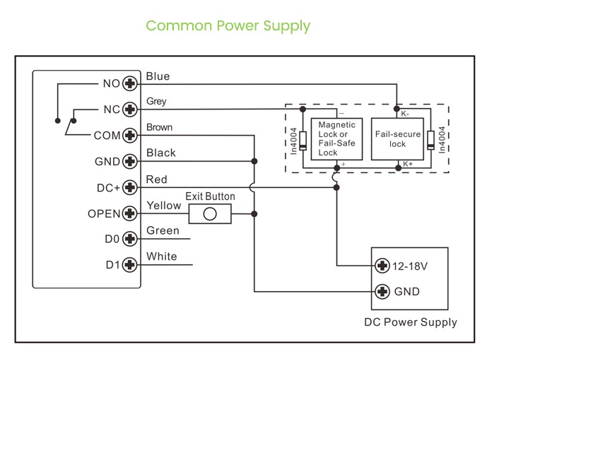 - Vezetékek csatlakoztatása: Relé kimenet, kilépő gomb, Wiegand bemenet, Wiegand kimenet